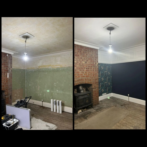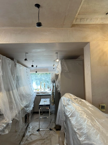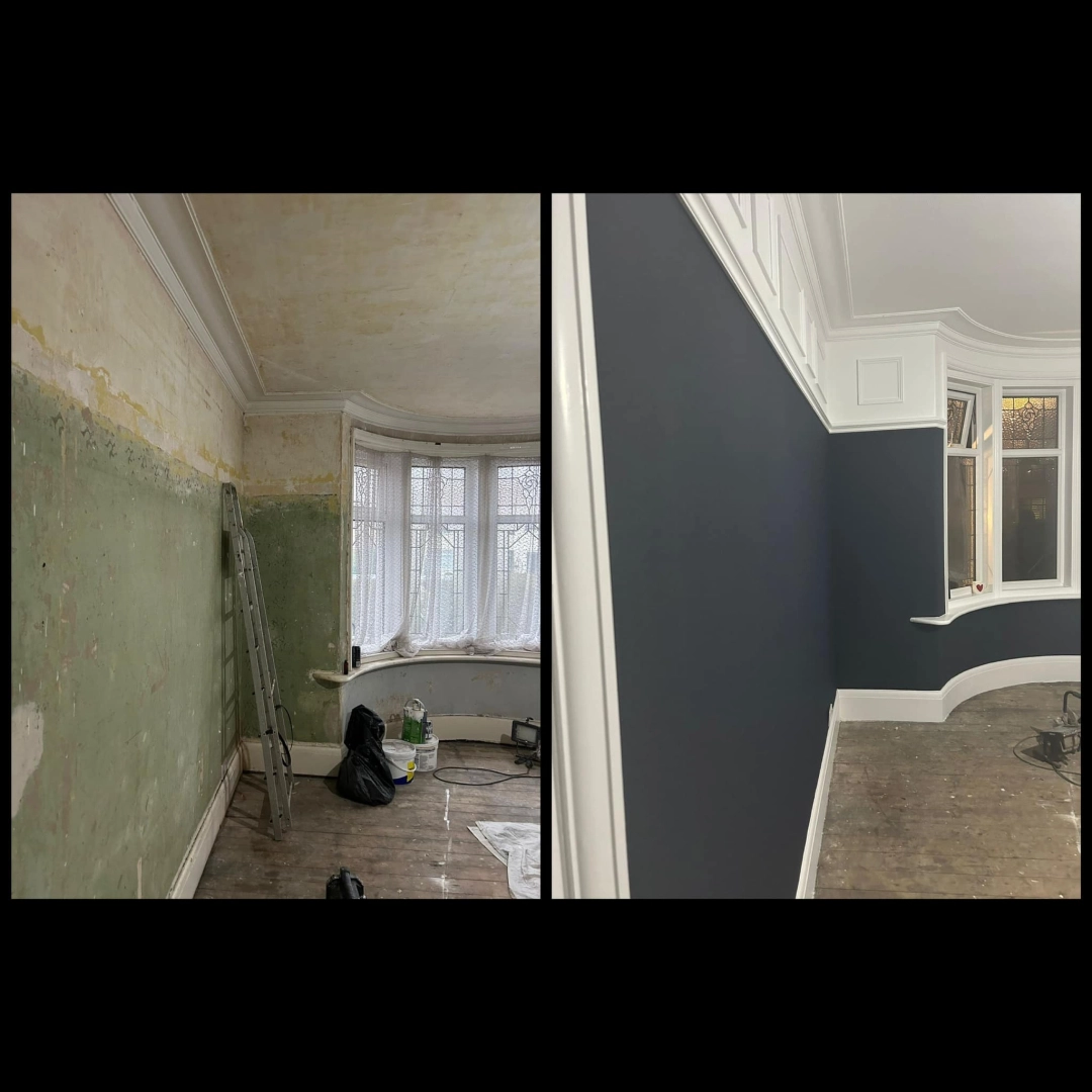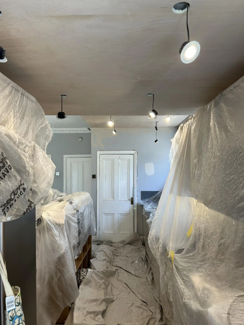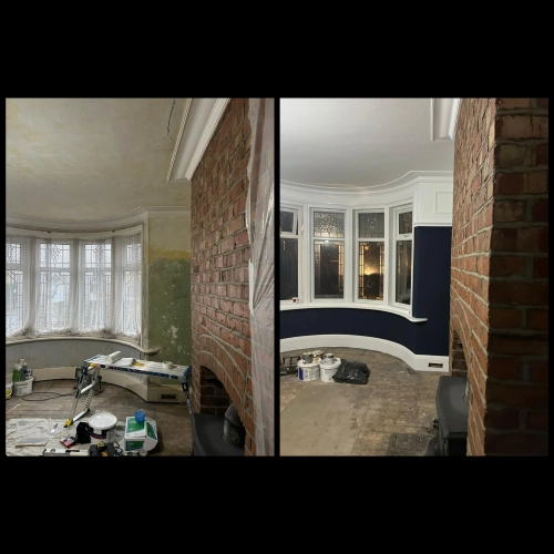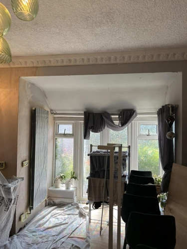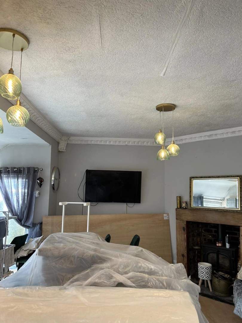 Living room redecoration with extensive prep work, including filling and sanding of ceilings and wal...
