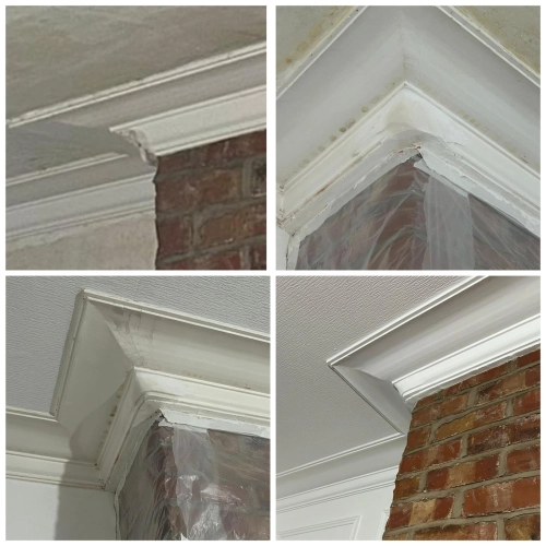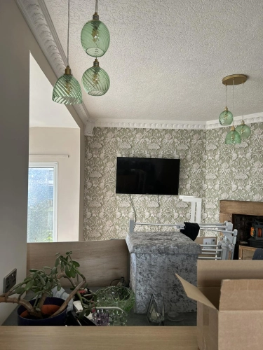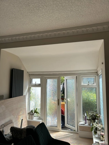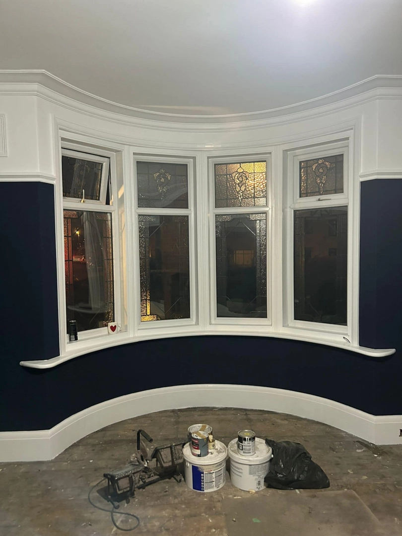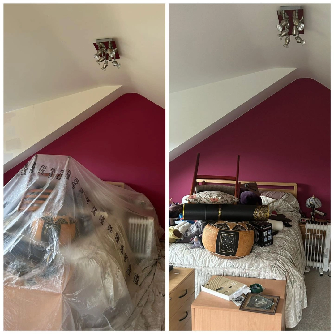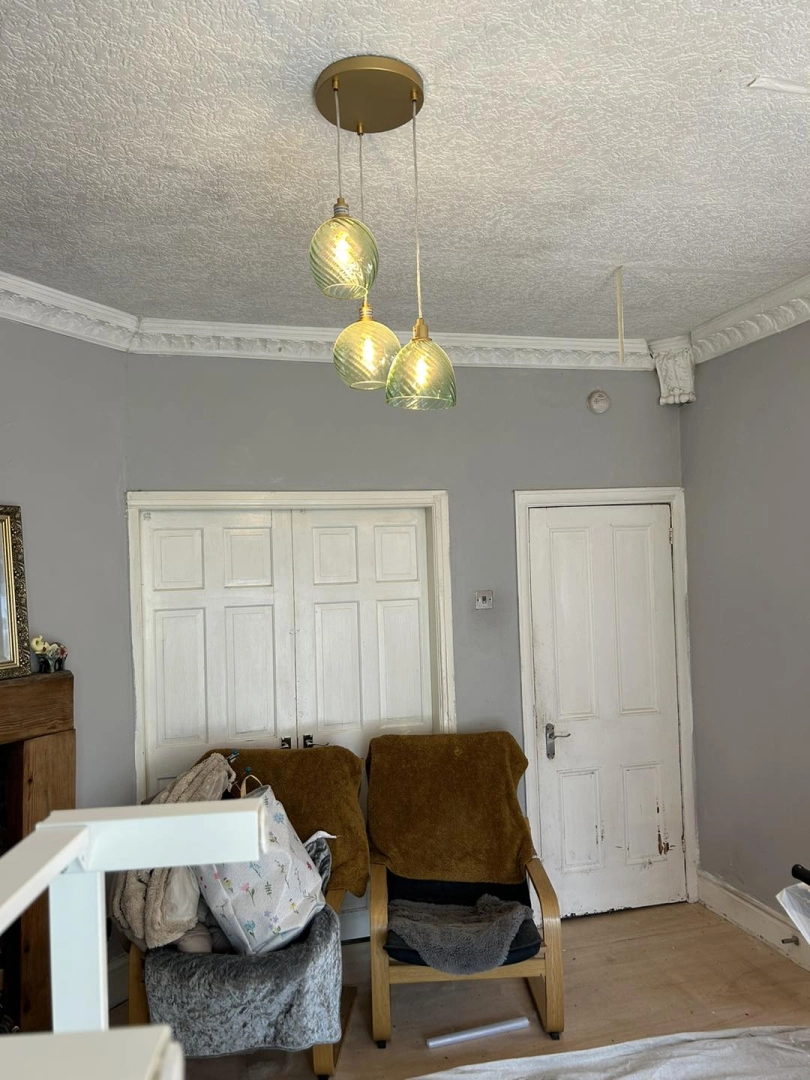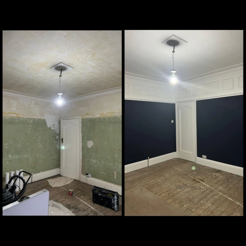 Living room redecoration with extensive prep work, including filling and sanding of ceilings and wal...